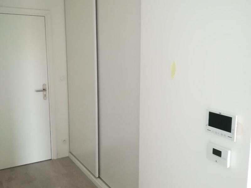 Une entrée avec placard, WC, une salle de bains avec branchement LL, deux chambres dont une avec placard, une cuisine aménagée et équipée (hotte, plaques, four) ouverte sur le séjour avec balcon exposé Sud.