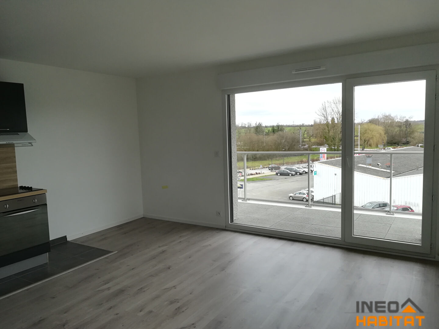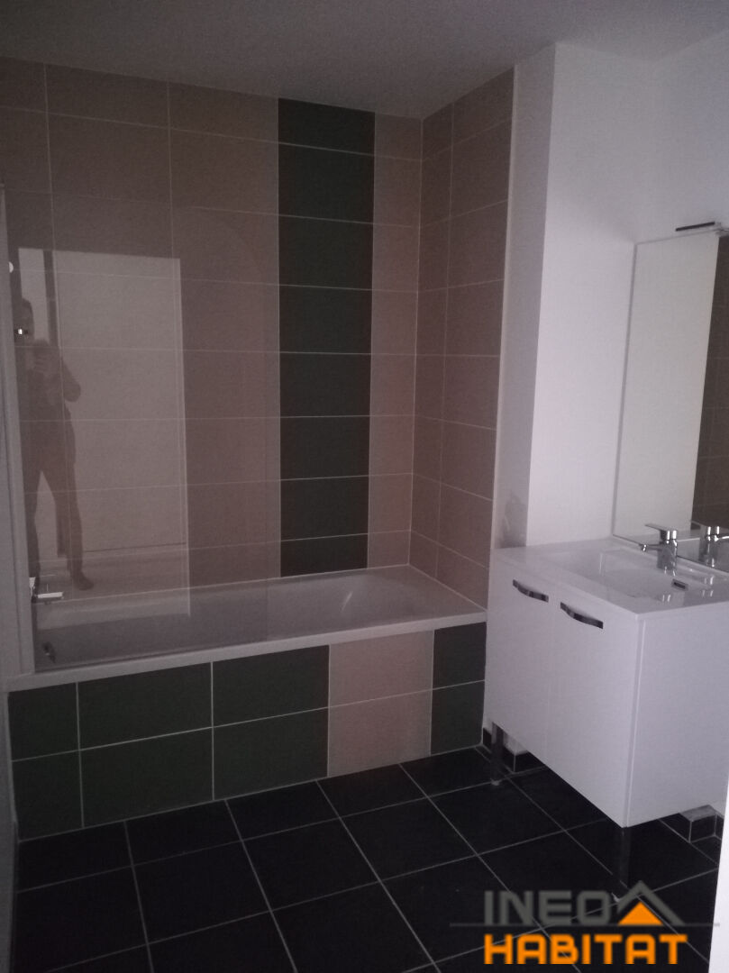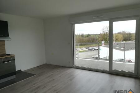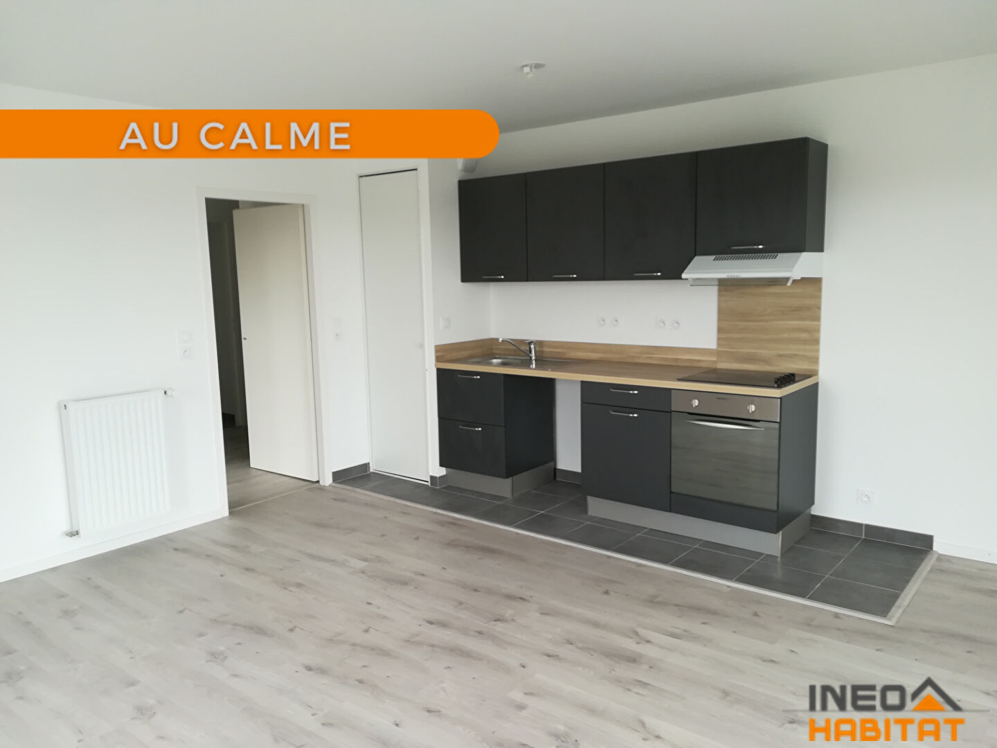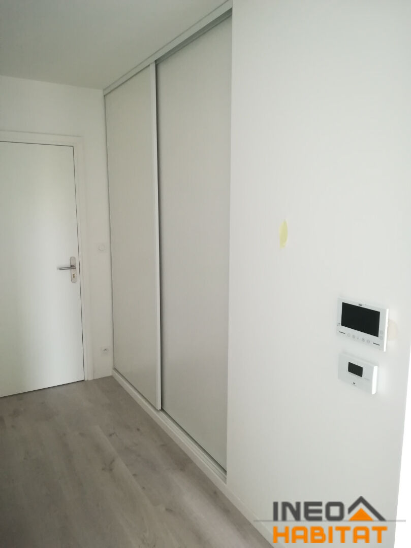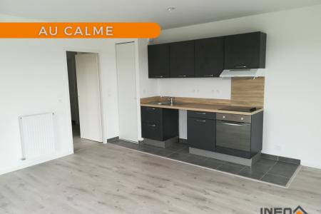 Une entrée avec placard, WC, une salle de bains avec branchement LL, deux chambres dont une avec placard, une cuisine aménagée et équipée (hotte, plaques, four) ouverte sur le séjour avec balcon exposé Sud, un cellier sur le palier.