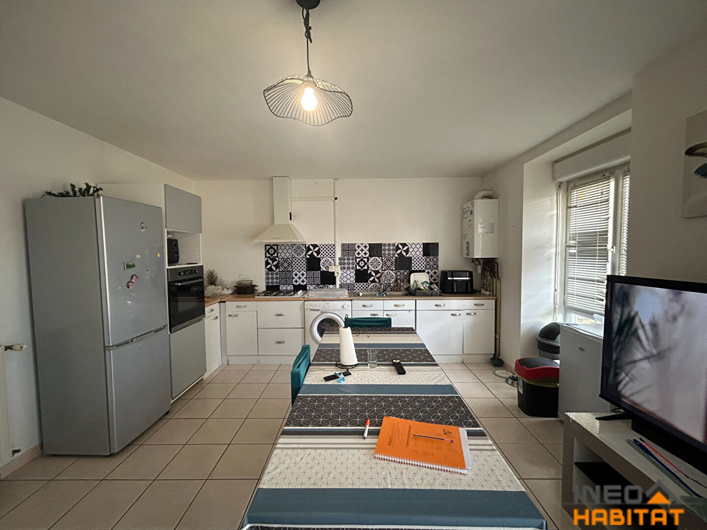 A LOUER Appartement T4 comprenant au rdc : un séjour salon ouvert sur une cuisine aménagée (plaque et hotte) , trois chambres dont une avec placard, une salle d'eau et un WC séparé.