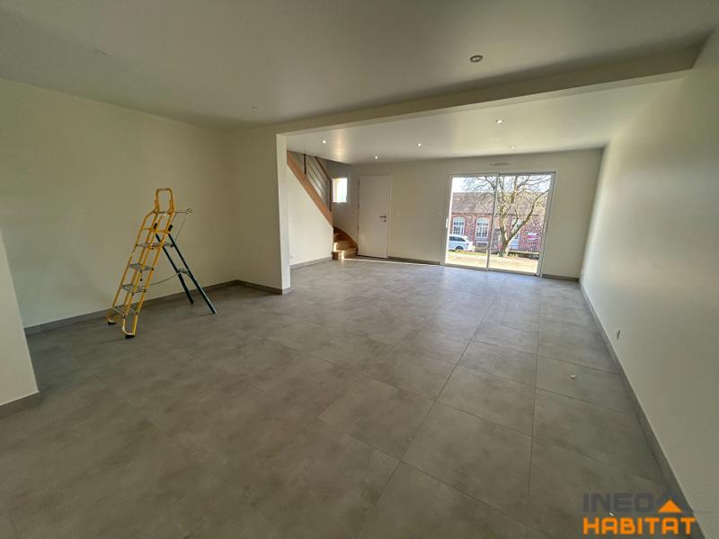 Maison T5 comprenant un séjour, une cuisine ouverte aménagée et équipée (four, plaque, hotte), un WC séparé, une chambre avec un dressing et une salle d'eau privative.