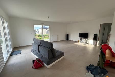 Maison T4 de plain-pied comprenant une cuisiné aménagée et équipée ouverte sur le séjour (four, plaque, hotte, lave vaisselle et frigo), 3 chambres, une salle d'eau ainsi qu'un WC séparé.