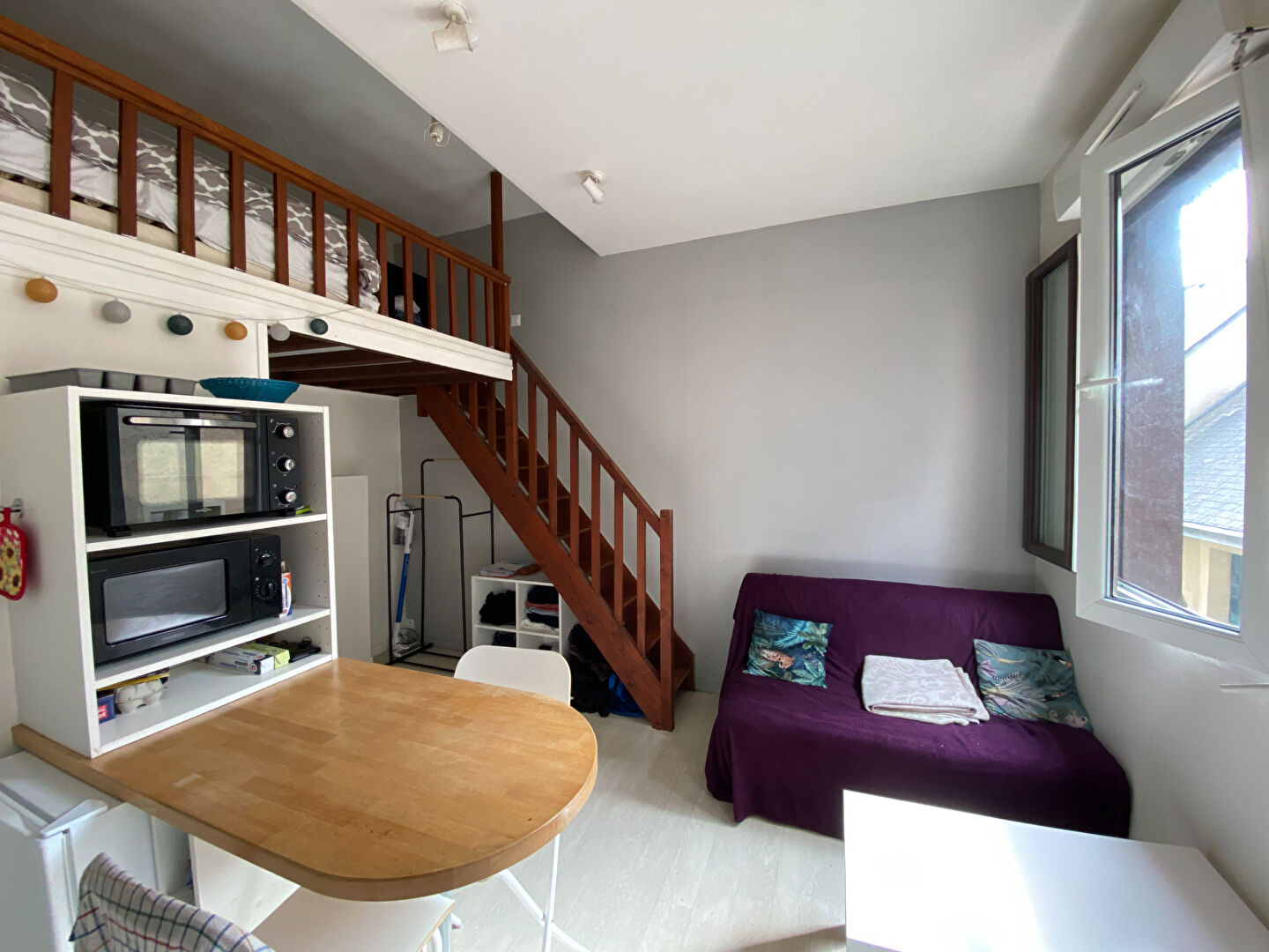 Studio meublé de 16 m² comprenant une pièce de vie avec un espace nuit sur mezzanine, une cuisine aménagée et équipée et une salle d'eau avec WC.