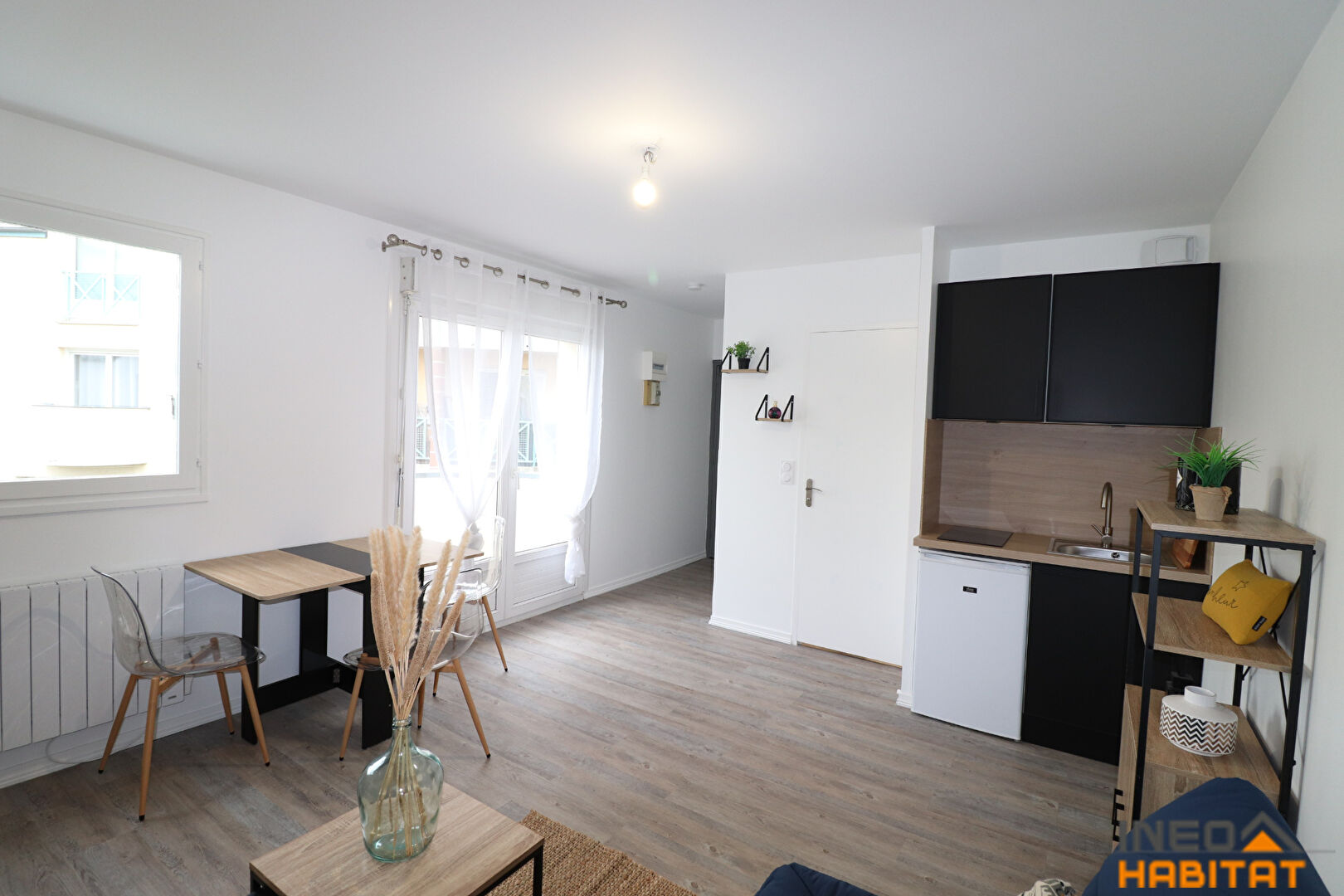 Studio meublé de 22.62 m² comprenant une entrée avec placard, une pièce de vie avec kitchenette aménagée et équipée (frigo, plaque de cuisson) et une salle d'eau avec WC. En annexe, un balcon.