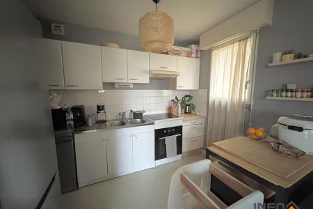 Appartement de type 3, non meublé, au premier étage d'une résidence avec ascenseur, comprenant une entrée avec placard, une cuisine ouverte aménagée et équipée (four, plaque de cuisson et hotte), un séjour donnant sur un balcon exposé Sud, deux chambres dont une avec grand placard, une salle de bains et WC séparés. En annexe, une place de parking souterraine.