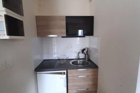 Une pièce principale exposée Ouest avec rangements et petit balcon, une kitchenette aménagée et équipée (plaques, réfrigérateur, micro-ondes), une salle d'eau avec un lave linge, WC.