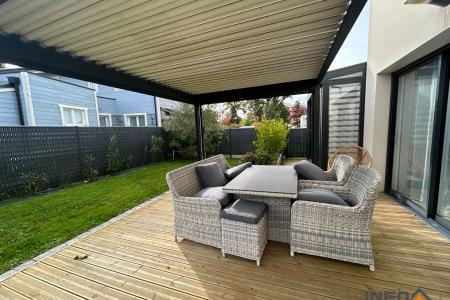 La maison comprend également une arrière cuisine, un garage, un jardin et une terrasse avec une pergola.