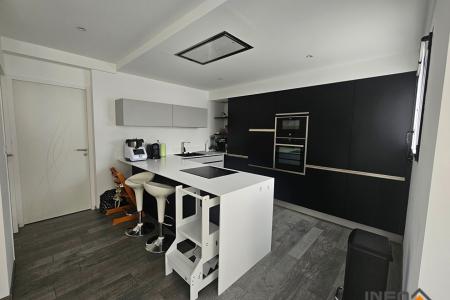 Au rez-de-chaussée : Une spacieuse et lumineuse pièce de vie avec cuisine aménagée et entièrement équipée ouverte, une suite parentale comprenant dressing et salle d'eau, ainsi que des WC indépendants.