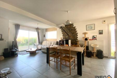 La maison offre au rez-de-chaussée une belle pièce de vie de 45 m² bénéficiant d'une triple exposition, garantissant une luminosité optimale tout au long de la journée. Cet espace permet d'aménager aisément un salon, une salle à manger tout en conservant une circulation fluide. La cuisine, entièrement aménagée et équipée (four, plaque de cuisson, hotte, lave-vaisselle), complète cet ensemble.