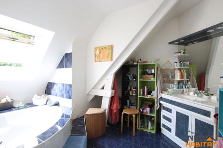 A l'étage, un palier dessert trois chambres avec rangements, une salle de bains ainsi qu'un grenier aménageable de 32 m² au sol, offrant un beau potentiel supplémentaire.