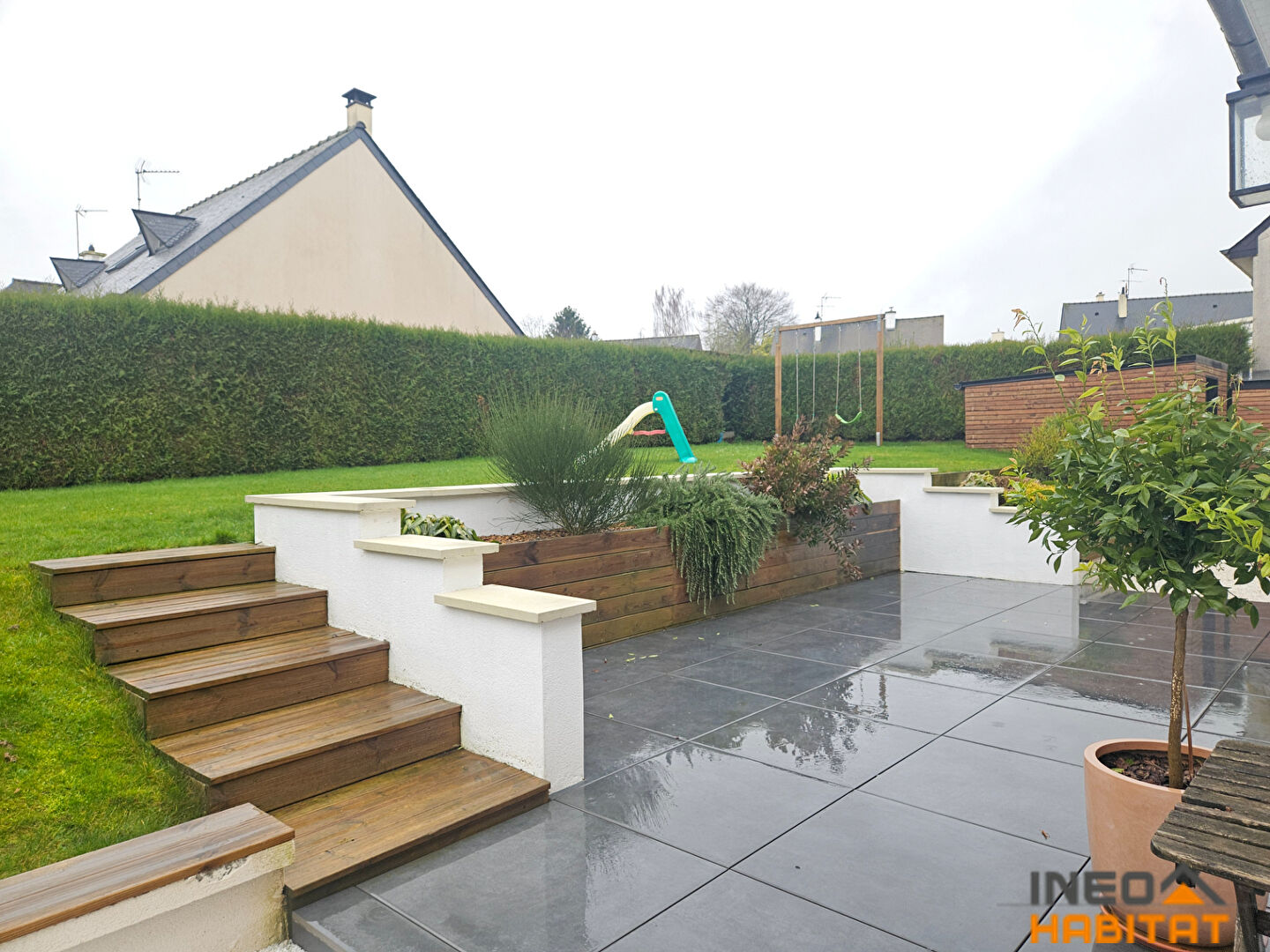 A l'extérieur, vous profiterez d'un terrain clos parfaitement aménagé avec une belle terrasse carrelée, idéal pour les moments de détente en famille ou entre amis.