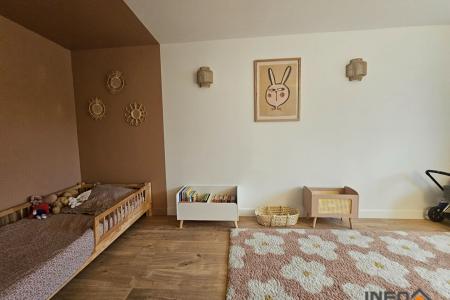 Dès l'entrée, vous découvrirez une agréable pièce de vie comprenant un salon-séjour lumineux avec un poêle à bois, ouvert sur une cuisine aménagée et entièrement équipée. 4 chambres, un bureau, une salle de bains équipée d'un meuble double vasque, ainsi qu'un WC.