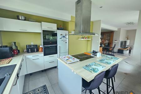 Elle se compose au rez-de-chaussée d'un accueil chaleureux , d'un vaste espace de vie lumineux incluant séjour, salon et cuisine ouverte entièrement équipée. Vous y trouverez également une suite parentale avec chambre, salle d'eau et dressing, ainsi que des WC séparés. Arrière cuisine