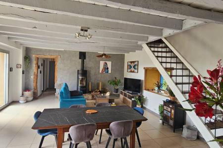 Entrée avec rangement, Un salon séjour lumineux avec poêle à bois, cuisine aménagée, une suite parentale (chambre, salle d'eau), une chambre/ bureau, buanderie, WC.