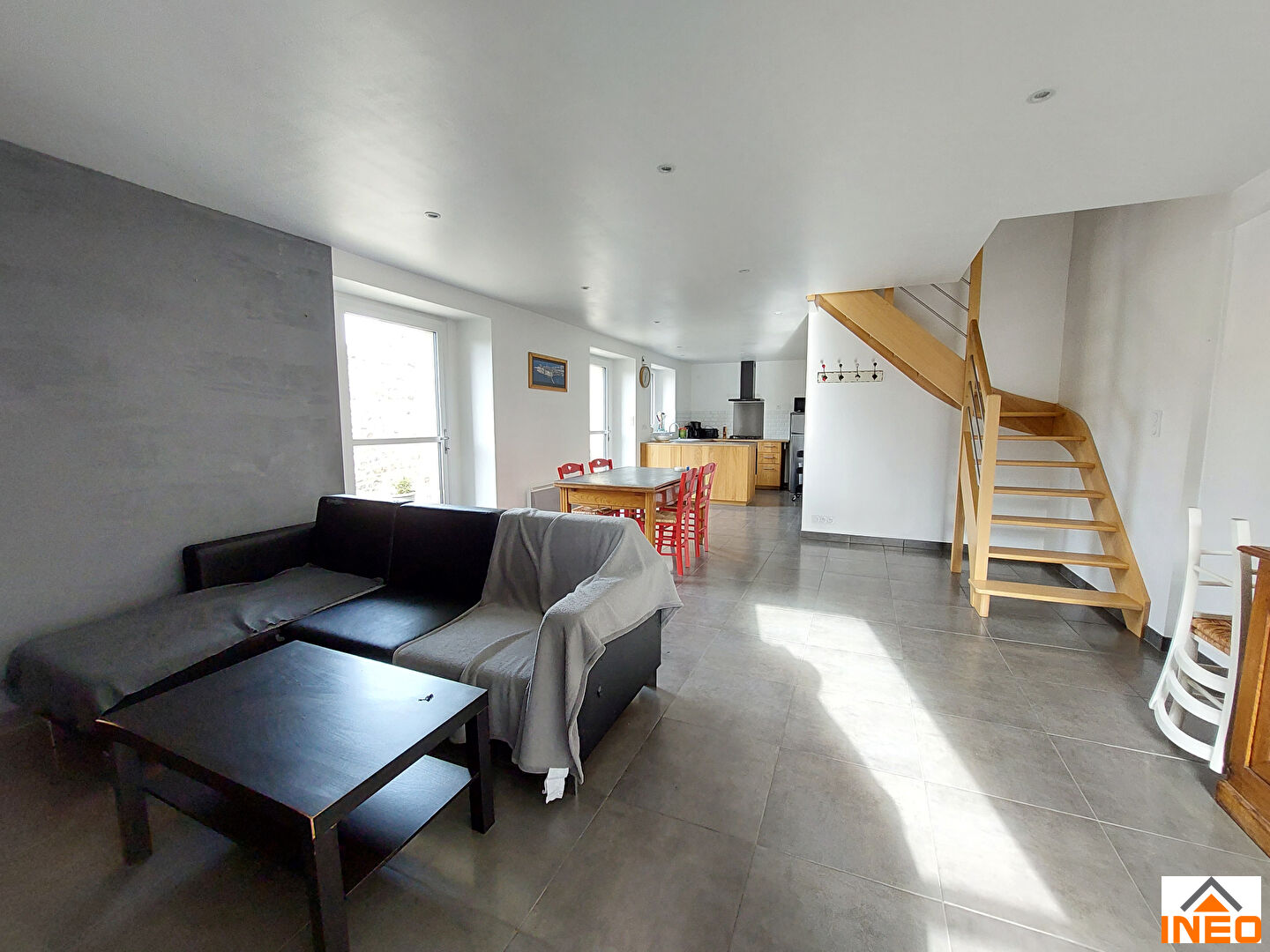 La maison principale comprend une grande entrée, une cuisine salle à manger, un salon avec cheminée insert, un bureau, un WC.