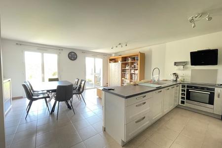 Une entrée avec placards donnant accès à un salon/séjour exposé Sud, une cuisine ouverte aménagée et équipée (meubles haut et bas, évier, four, plaque, hotte, lave-vaisselle), une arrière cuisine, un wc séparé avec lave-mains.