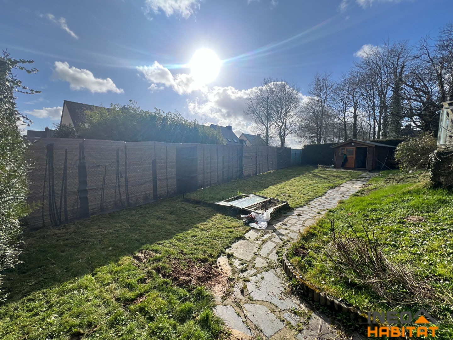 Une allée de stationnement et un terrain clos et arboré avec jardin et abri de jardin et grande terrasse. Environnement calme, et sans vis à vis.