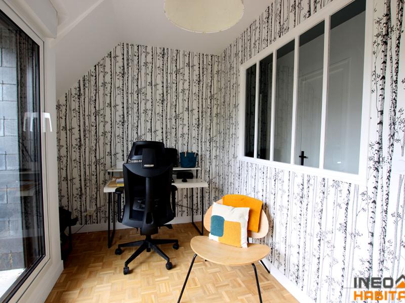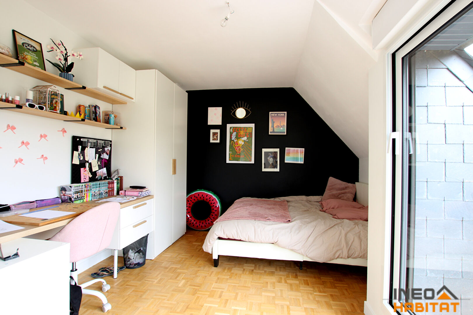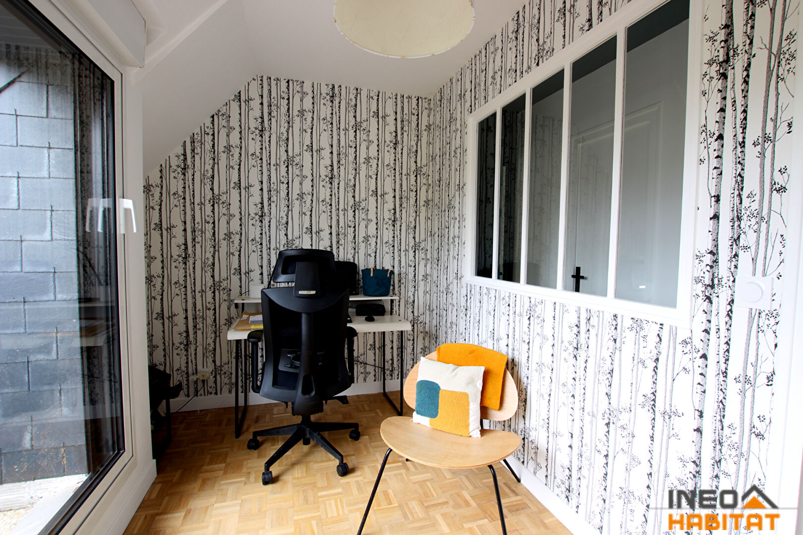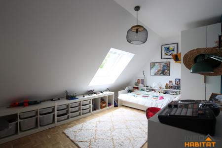 A l'étage, le palier distribue trois chambres lumineuses dont une pouvant acceuillir un espace dressing . Vous trouverez également un bureau, une salle de bains ainsi qu'un WC séparé pour plus de commodité.