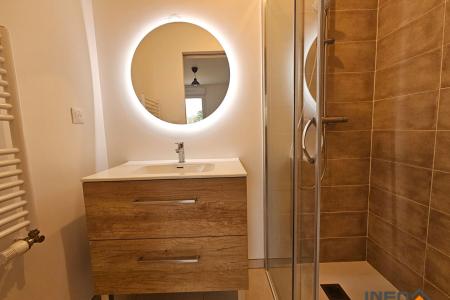 A l'étage, le palier dessert trois chambres avec placards, une salle de bains équipée d'une baignoire et d'un meuble double vasque, ainsi qu'un WC séparé.