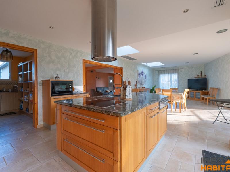 Maison T5 édifiée en 1978 ayant bénéficiée d'une extension en 2010 pour un total de 160m² habitable comprenant, une entrée desservant un séjour avec cheminée insert exposé SUD et espace bureau, une salle à manger avec cuisine ouverte aménagée et équipée (ilot centrale, chauffe plat, four, plaque, hotte, lave-vaisselle, frigo et micro-onde) le tout donnant plein OUEST pour un total à vivre de plus de 86m² . Une arrière cuisine avec meuble et évier ainsi qu'un WC.