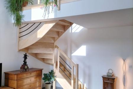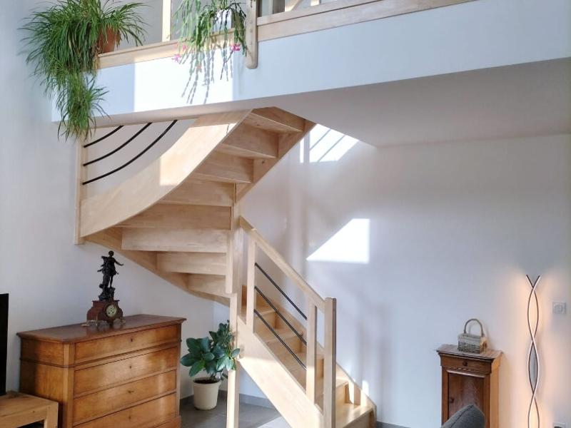 A l'étage, une mezzanine desservant deux chambres lumineuses. Vous trouverez également une salle d'eau ainsi qu'un WC séparé pour plus de commodité.