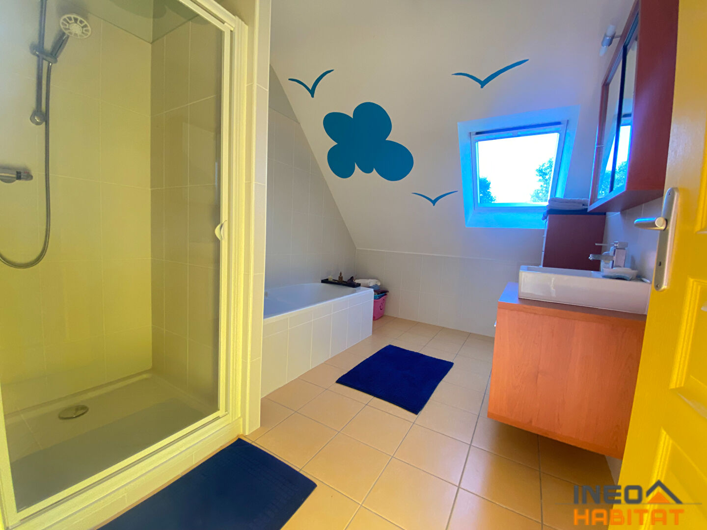 A l'étage on retrouve une mezzanine parfait pour le télétravail, un dégagement donnant sur 2 chambres avec placards, une salle de bain avec douche, lavabo, baignoire. Un WC séparé. Un espace raccordé à l'électricité avec chauffage il ne manque plus que le velux pour faire une 4-ème chambre de plus de 13 m² au sol.