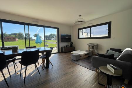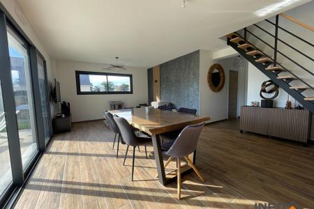 Une superbe maison contemporaine de 2022, dans un environnement calme, comprenant au rez-de-chaussée : Une entrée, WC, une pièce de vie lumineuse, une cuisine aménagée et équipée, un cellier.