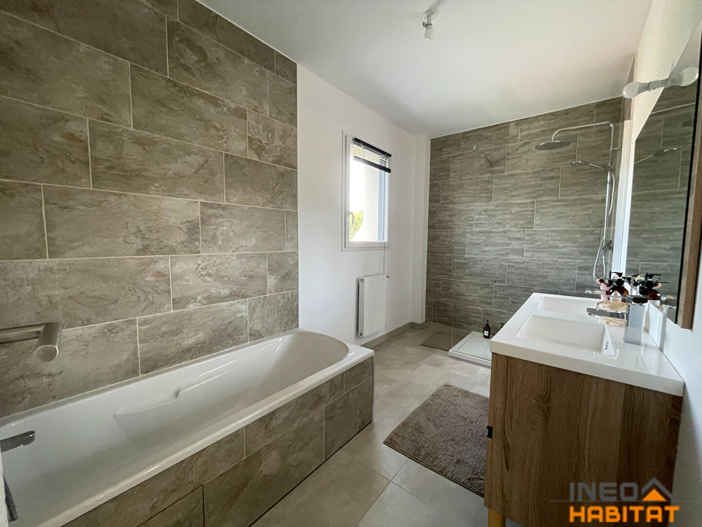 Une superbe maison contemporaine de 2022, dans un environnement calme, comprenant au rez-de-chaussée : Une entrée, WC, une pièce de vie lumineuse, une cuisine aménagée et équipée, un cellier.