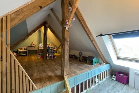 A l'étage : un dégagement avec dressing desservant : 3 chambres, une salle de jeux, un bureau, une salle de bains avec un WC.