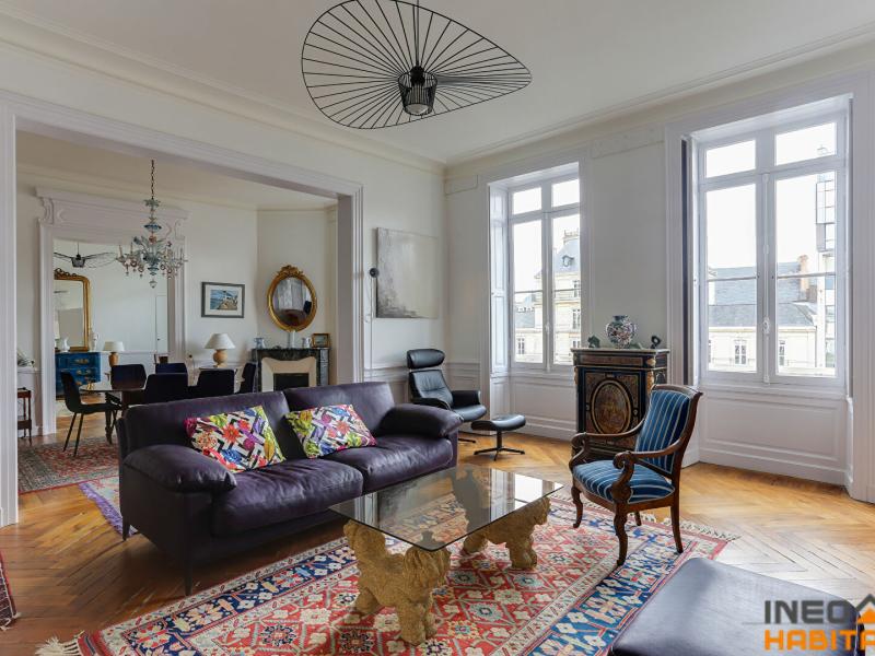 RENNES Les Quais - Dans un bel immeuble avec ascenseur, appartement de grand standing avec triple pièce de réception sur parquet et vue sur la Vilaine. Ce magnifique appartement comprend: Entrée, vaste séjour/salle à manger de 46m², salon transformable en une 4eme chambre, cuisine aménagée et équipée Bulthaup, 3 chambres de 14 à 20m², 2 salles d'eau, buanderie. Grenier et cave. Ce bien de grande qualité, a conservé ses parquets massifs et cheminées et tout le charme de l'ancien. Parking sur Arsenal en abonnement. (3.66 % honoraires TTC à la charge de l'acquéreur.)