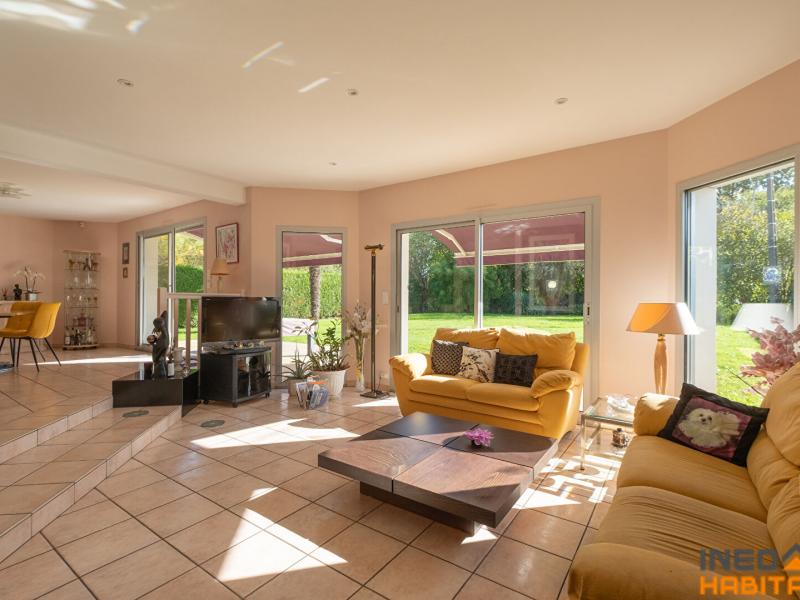 Elle comprend une vaste entrée desservant une grande pièce à vivre exposée SUD avec espace salle à manger et un coin salon et sa cheminée à foyer ouvert. Une cuisine ouverte aménagée et équipée (four, plaque, hotte, lave-vaisselle et cave à vin) et son ilot ainsi qu'une arrière cuisine attenante elle aussi aménagée. Un cellier. Un espace bureau aménageable en chambre ainsi qu'un point d'eau avec placard desservant un WC complète le rez de chaussée.