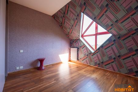 Maison T6 d'architecte située à Saint Grégoire, dans un lotissement calme, dessinée et édifiée en 1990 pour une surface d'environ 142m² agencée en demie niveaux, vous trouverez :