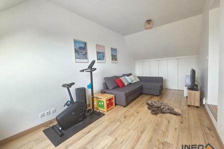 A l'étage, le palier distribue quatre chambres, toutes dotées de rangements intégrés. S'ajoutent une salle de bains familiale équipée de double vasque, ainsi qu'un second WC indépendant.