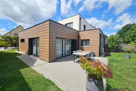 Édifiée en 2017 sur une parcelle de 440 m², cette maison offre de de beaux volumes, des prestations de qualité et une vie de plain-pied très appréciée.