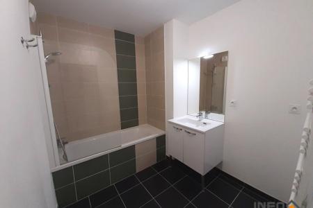 Une entrée avec placard, WC, une salle de bains avec branchement LL, deux chambres dont une avec placard, une cuisine aménagée et équipée (hotte, plaques, four) ouverte sur le séjour avec balcon exposé Sud, un cellier sur le palier.