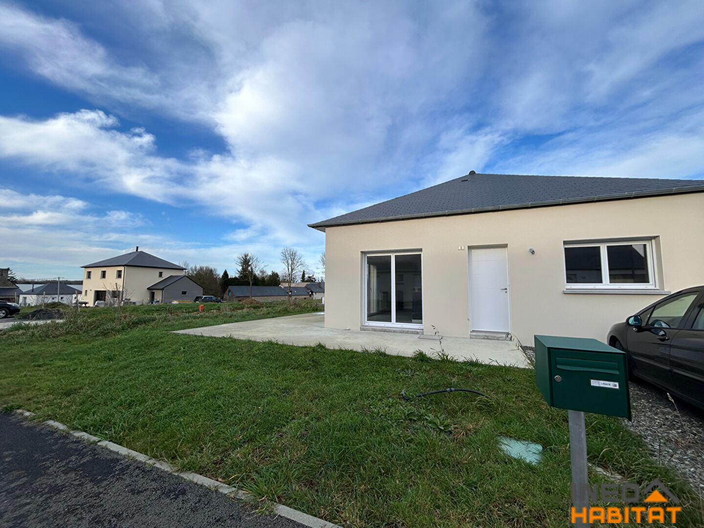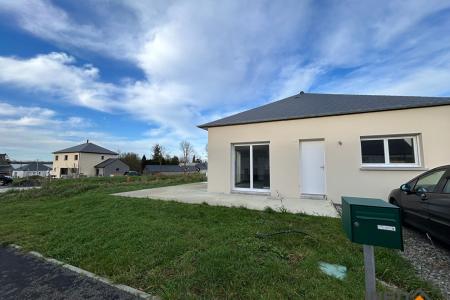Maison T4 de plain-pied comprenant une cuisiné aménagée et équipée ouverte sur le séjour (four, plaque, hotte, lave vaisselle et frigo), 3 chambres, une salle d'eau ainsi qu'un WC séparé.