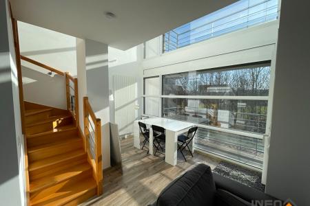 Appartement de type 4 en duplex non meublé comprenant une entrée avec placard, un salon-séjour avec accès sur un premier balcon, une cuisine aménagée et équipée et un WC. A l'étage, une salle de bains, un dressing, trois chambres dont une avec placard et une avec un accès direct sur un deuxième balcon. Un garage double fermé en sous sol .