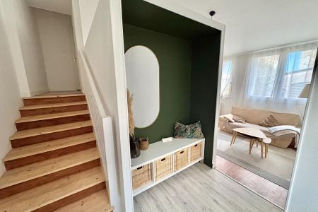 Un appartement T2 en duplex rénové avec goût, comprenant une entrée, un salon, une cuisine aménagée et équipée (plaque, frigo) , une chambre ainsi qu'une salle de bain avec WC.