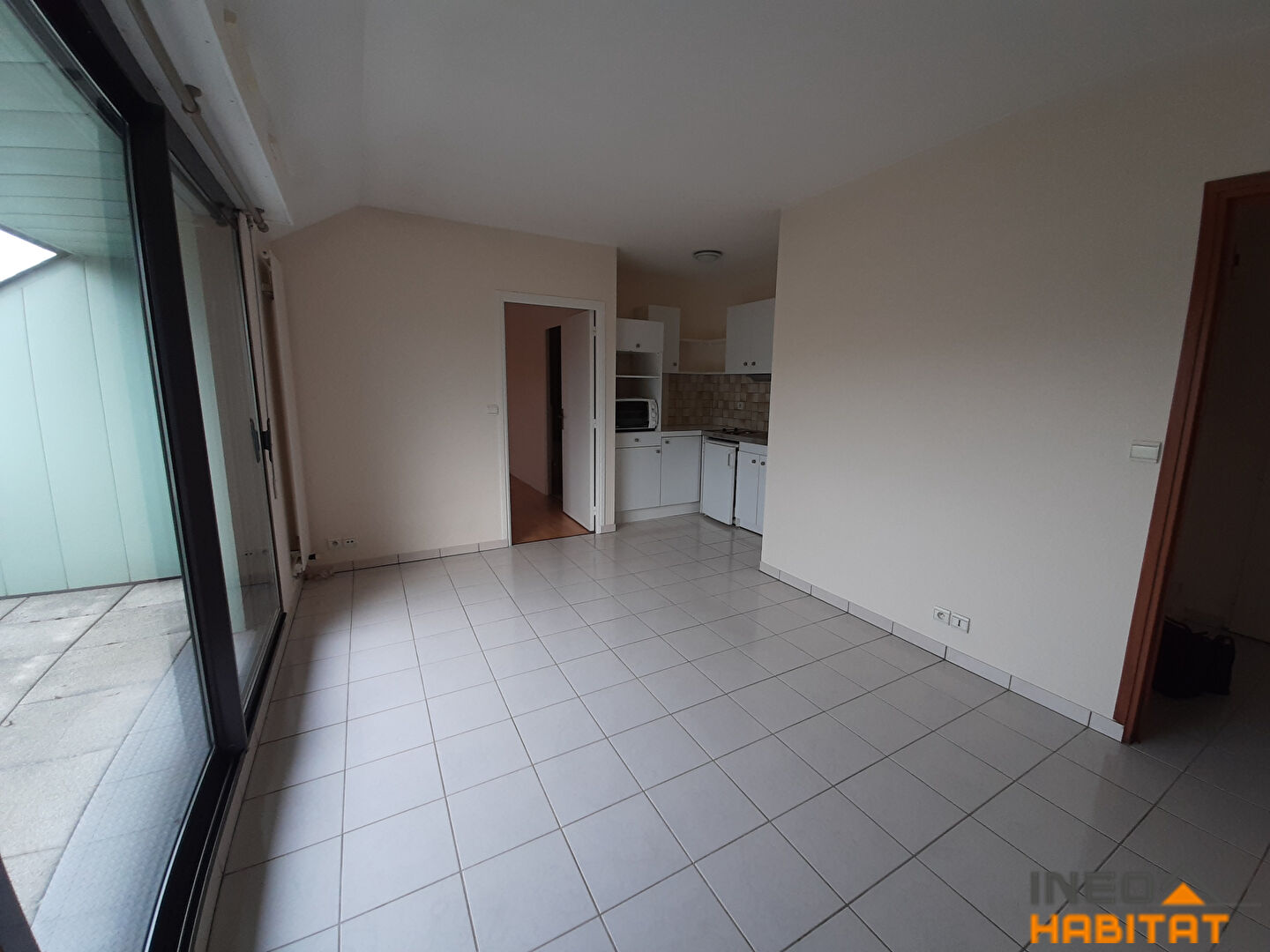 Un entrée, un cellier, WC, un salon/séjour exposé Ouest avec terrasse, un coin kitchenette équipée (plaques et réfrigérateur), une chambre avec placard, une salle de bains attenante.