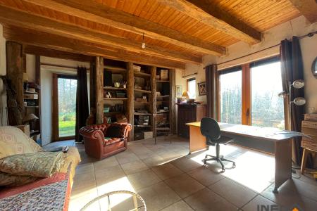 A l'extérieur : Un hangar rénové, un cabanon de jardin. Carport, bucher. Le tout sur une parcelle de terrain arboré, d'environ de 2 hectares. Des prairies.