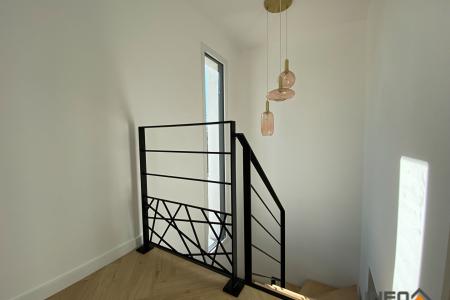 A l'étage, un escalier sur mesure en fer forgé mène à une mezzanine idéale pour le télétravail ou un espace détente. Vous y trouverez trois belles chambres avec placards (plus de 11 m² chacune), une salle d'eau à finaliser selon vos envies, ainsi qu'un WC séparé.
