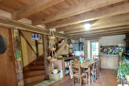 Au rez-de-chaussée : un séjour salon avec poêle à bois, une cuisine aménagée , une chambre avec lavabo. Ancienne salle d'eau, chaufferie.