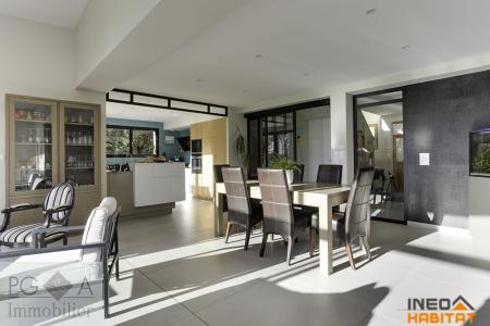 LIFFRE - Dans un parc arboré et paysager, cette maison traditionnelle a bénéficié d'une rénovation complète par architecte et d'une extension lui conférant une surface habitable de 207m². La maison, aux prestations de haut de gamme, comprend: au rdc: entrée, bureau avec placards, vaste salon de plus de 60m² et cuisine aménagée et équipée, tous deux ouvrants par de larges baies sur une terrasse plein sud, protégée par des stores bannes, arrière-cuisine, chambre, salle d'eau, WC, buanderie. A l'étage: 3 chambres, WC, salle de bains et douche. En sous-sol avec un accès de plain pied au jardin et à une autre terrasse, piscine intérieure chauffée, salle d'eau, cave, atelier, pièce technique, double garage. Abri de jardin avec borne de rechargement pour voiture électrique. Le terrain sans vis-à-vis offre une vue dégagée sur la campagne environnante. Arrêt de bus à 100m, accès 4 voies à quelques minutes. Chauffage par géothermie verticale.