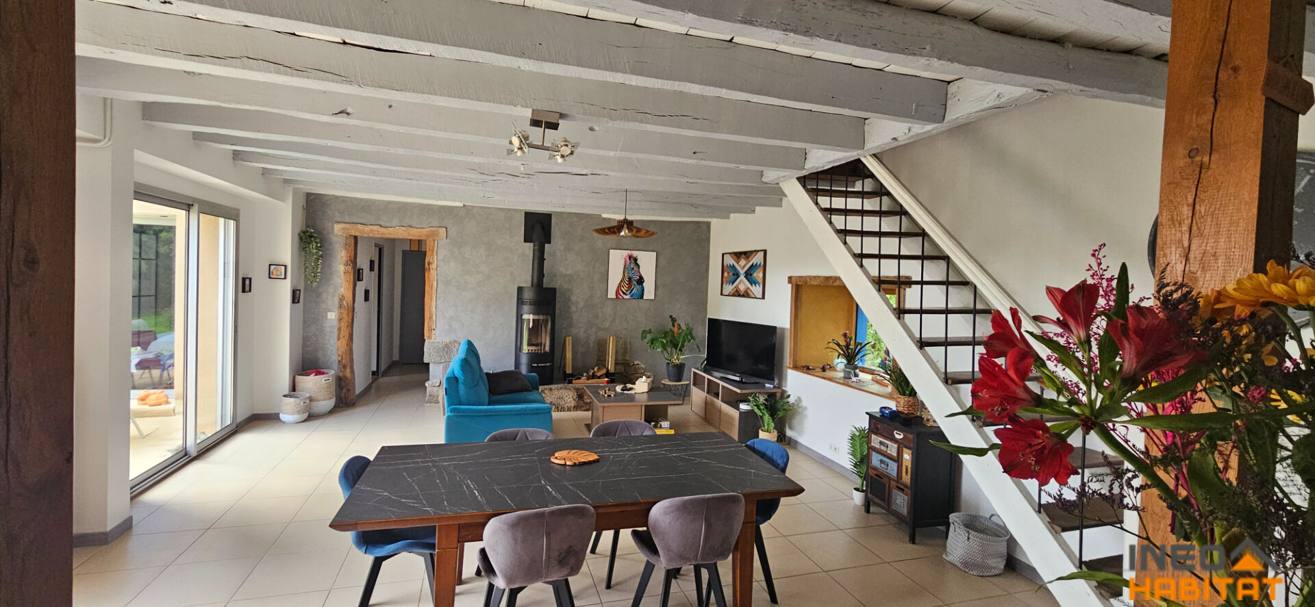 Entrée avec rangement, Un salon séjour lumineux avec poêle à bois, cuisine aménagée, une suite parentale (chambre, salle d'eau), une chambre/ bureau, buanderie, WC.