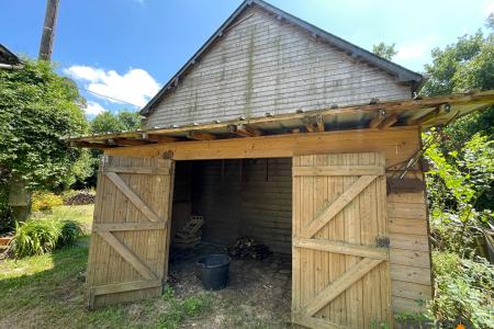 A l'extérieur : Un hangar rénové, un cabanon de jardin. Carport, bucher. Le tout sur une parcelle de terrain arboré, d'environ de 2 hectares. Des prairies.