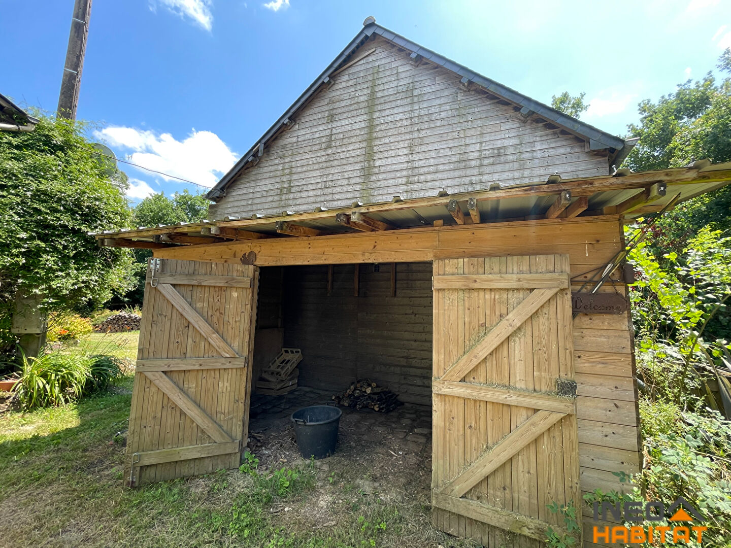 A l'extérieur : Un hangar rénové, un cabanon de jardin. Carport, bucher. Le tout sur une parcelle de terrain arboré, d'environ de 2 hectares. Des prairies.