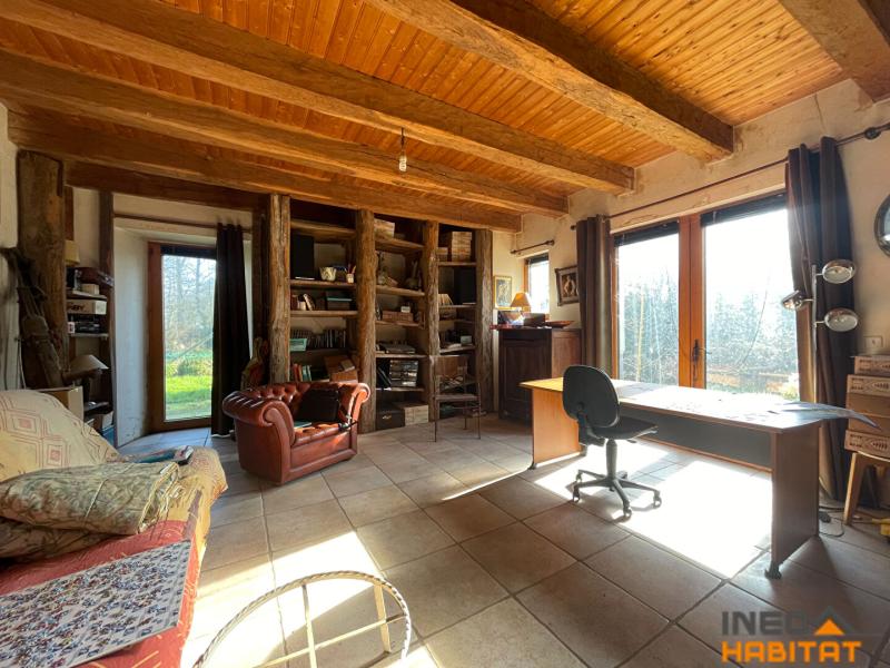 A l'extérieur : Un hangar rénové, un cabanon de jardin. Carport, bucher. Le tout sur une parcelle de terrain arboré, d'environ de 2 hectares. Des prairies.