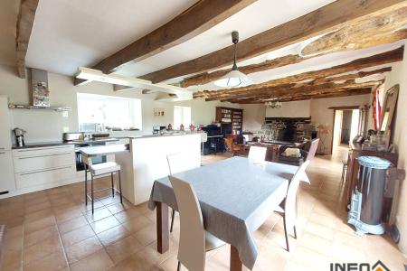 Longère rénovée comprenant un entrée avec placard, un salon/séjour avec cheminée , une cuisine aménagée et équipée, un garage, une chambre, une salle d'eau, un WC et une chaufferie.