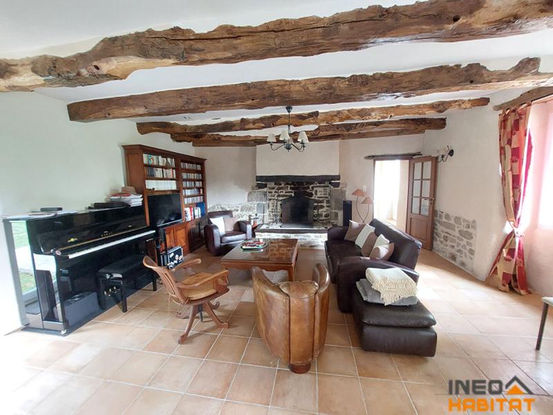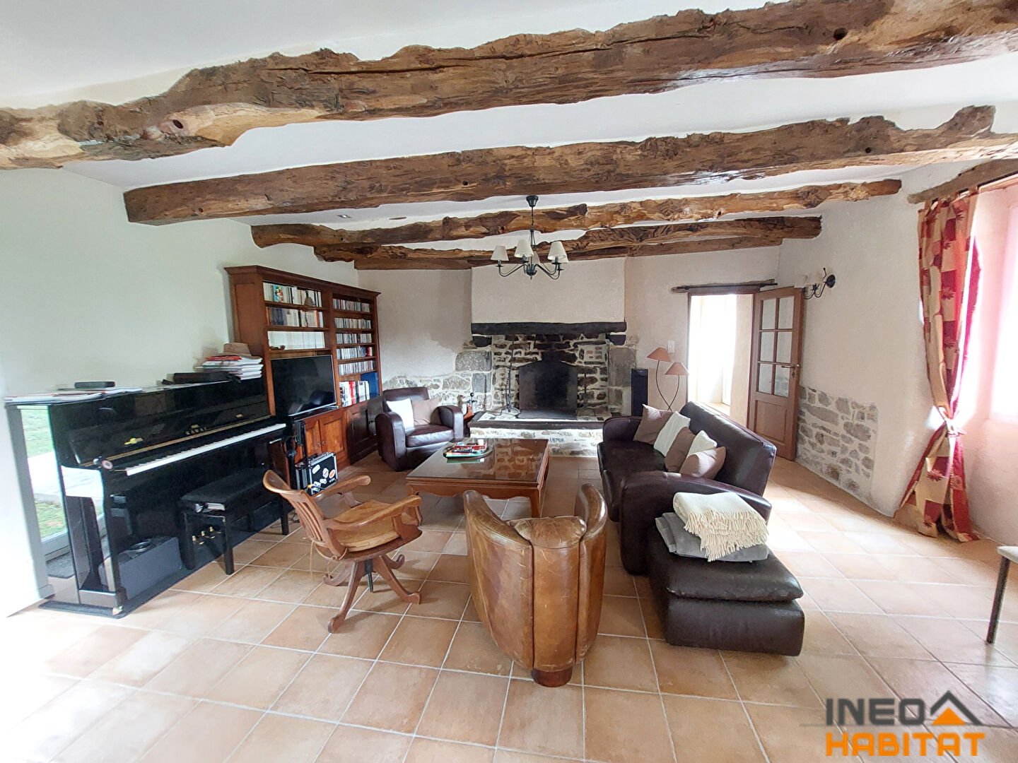 Longère rénovée comprenant un entrée avec placard, un salon/séjour avec cheminée , une cuisine aménagée et équipée, un garage, une chambre, une salle d'eau, un WC et une chaufferie.