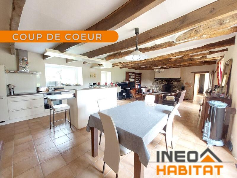Longère rénovée comprenant un entrée avec placard, un salon/séjour avec cheminée , une cuisine aménagée et équipée, un garage, une chambre, une salle d'eau, un WC et une chaufferie.