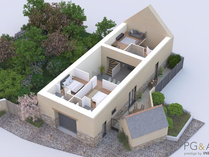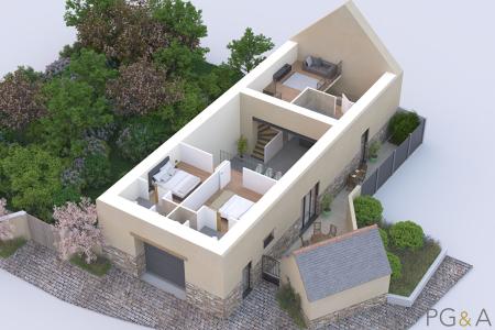 Un permis a été déposé pour sa rénovation, permis qui peut être repris en l'état ou modifié en en faisant la demande en mairie. La configuration et le permis déposés prévoient la création d'un garage accessible en pignon, d'un vaste espace de vie au RDC et de 3 chambres à l'étage. Les plans actuels proposent 150m² de surface habitable environ.